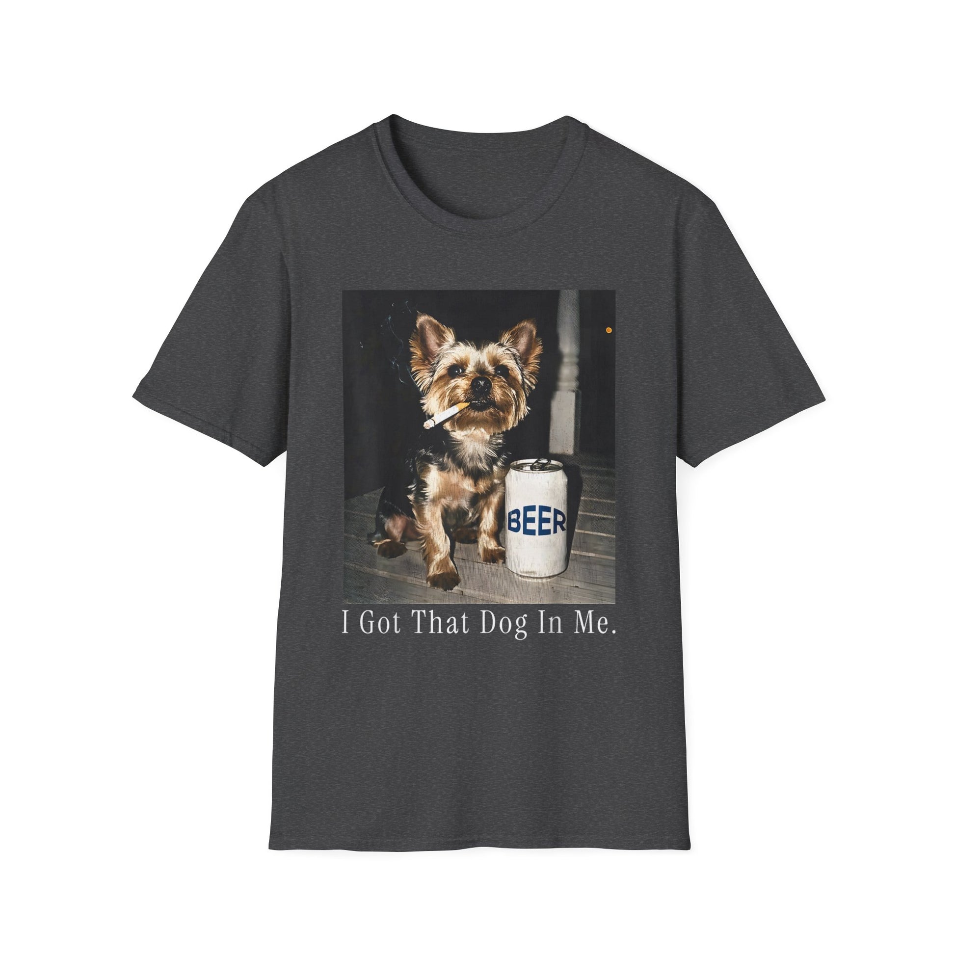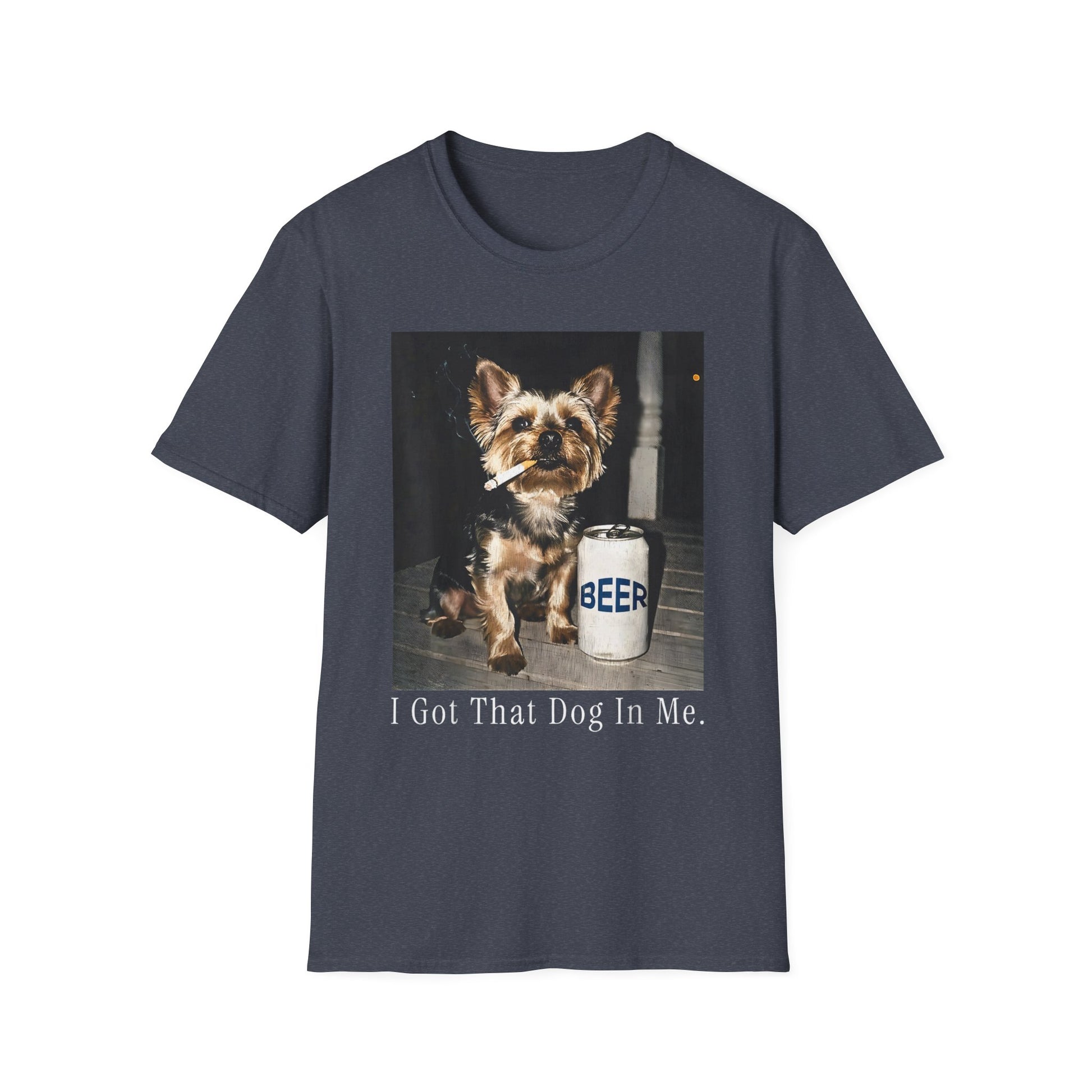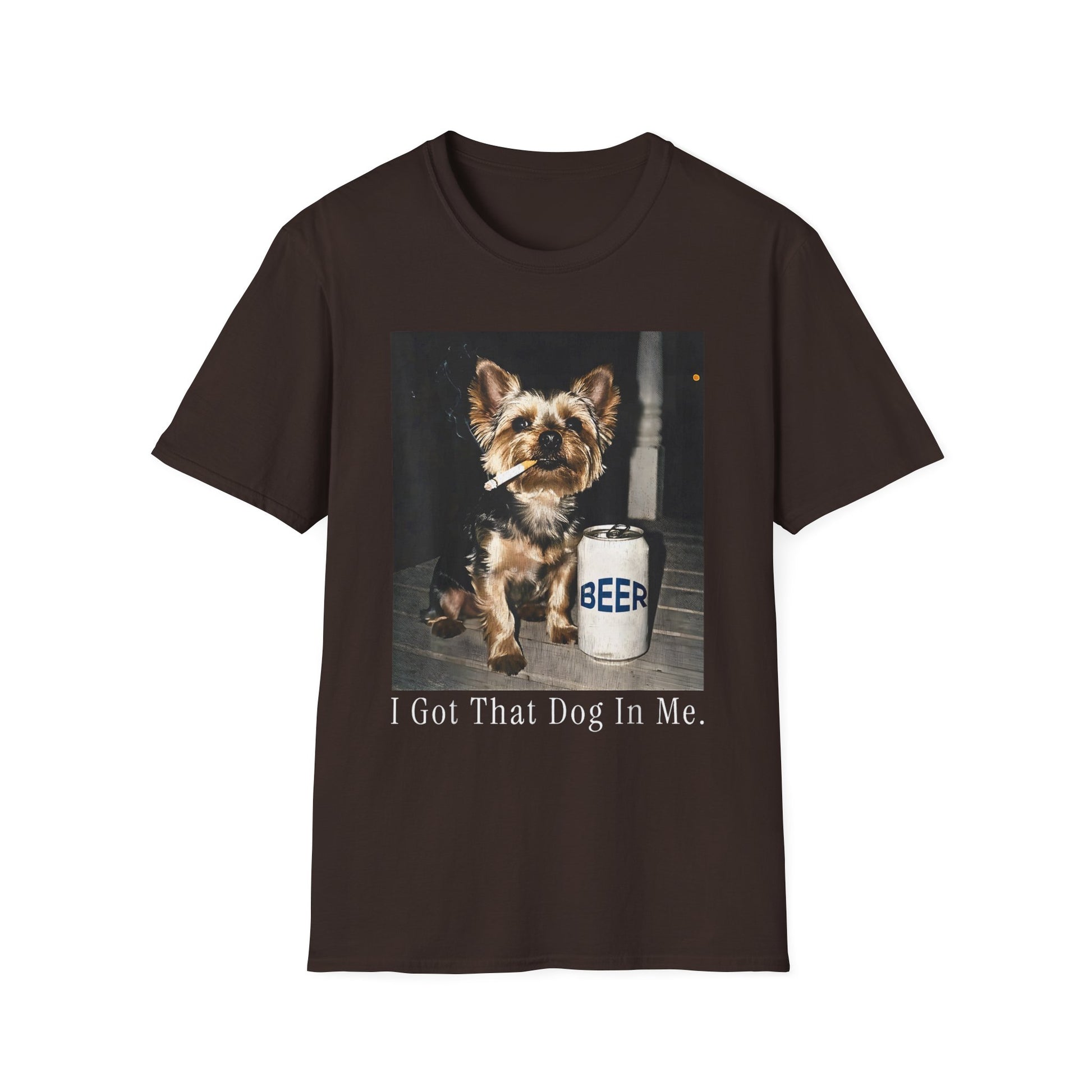 This lightweight crew-neck tee brings a touch of tongue-in-cheek charm to casual days. A vintage-style photo of an alert little dog beside a frosty beer jug sits centered on the chest, captioned, “I Got That Dog In Me.” The muted print tones and classic fit make it feel lived-in from the first wear. Layer it under a flannel for backyard barbecues or wear it solo while you roam the neighborhood with your pup — it’s for people who love a quiet laugh and a comfortable shirt that moves with them.